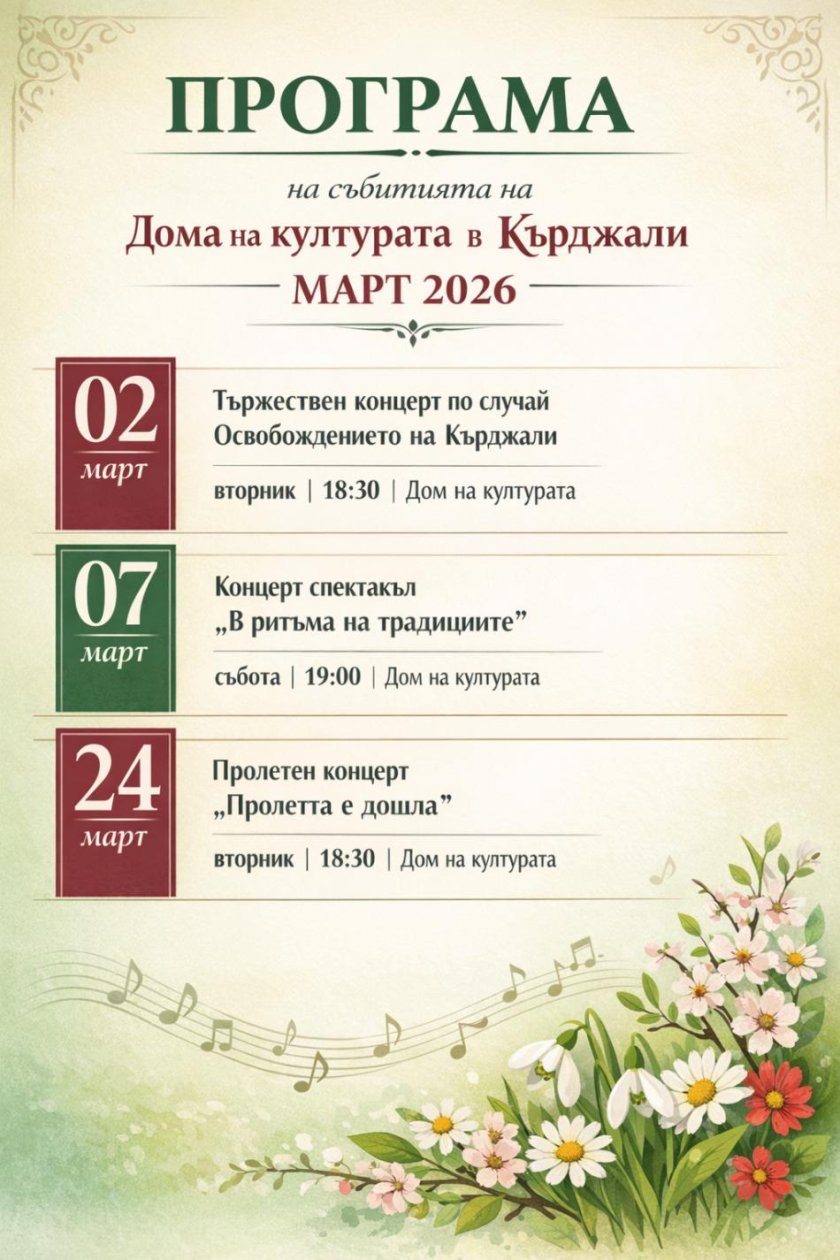 Дом на културата – Кърджали обяви официалната си програма за месец март 2026 г., която включва празнични и пролетни концерти за жителите и гостите на Кърджали.