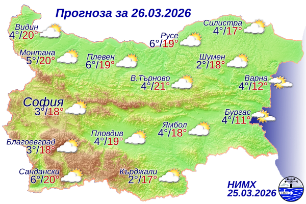 Днес в страната ще преобладава слънчево време с разкъсана висока облачност, а следобед над западните райони ще се развие и незначителна купеста облачност. Вятърът ще бъде до умерен, като в районите по северните склонове на планините и по долината на Струма ще се усилва и на места ще бъде силен от юг.